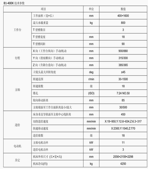 B1-400K 立式升降臺(tái)銑床是我廠原X53k基礎(chǔ)上的改型產(chǎn)品。X53k曾榮獲機(jī)械工業(yè)部頒發(fā)的 “質(zhì)量信得過產(chǎn)品”稱號(hào)。該產(chǎn)品結(jié)構(gòu)可靠、性能好、質(zhì)量穩(wěn)定、操作方便,適用于各類機(jī)械加工,可加工各種平面、溝槽、齒輪等。配置圓工作臺(tái)、分度頭等銑床附件,可進(jìn)一步擴(kuò)大機(jī)床的使用范圍。